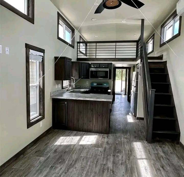 Modern tiny home interior with high ceilings, large windows, and a sleek black ceiling fan. Features a loft with stairs, kitchenette, and wood flooring.